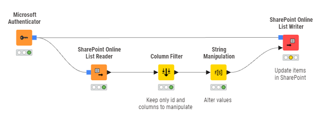 The lookup of items by column values as described before could be implemented by retrieving all list items into KNIME. Once they are in KNIME you can filter and updating them. So a typical workflow would look like this: