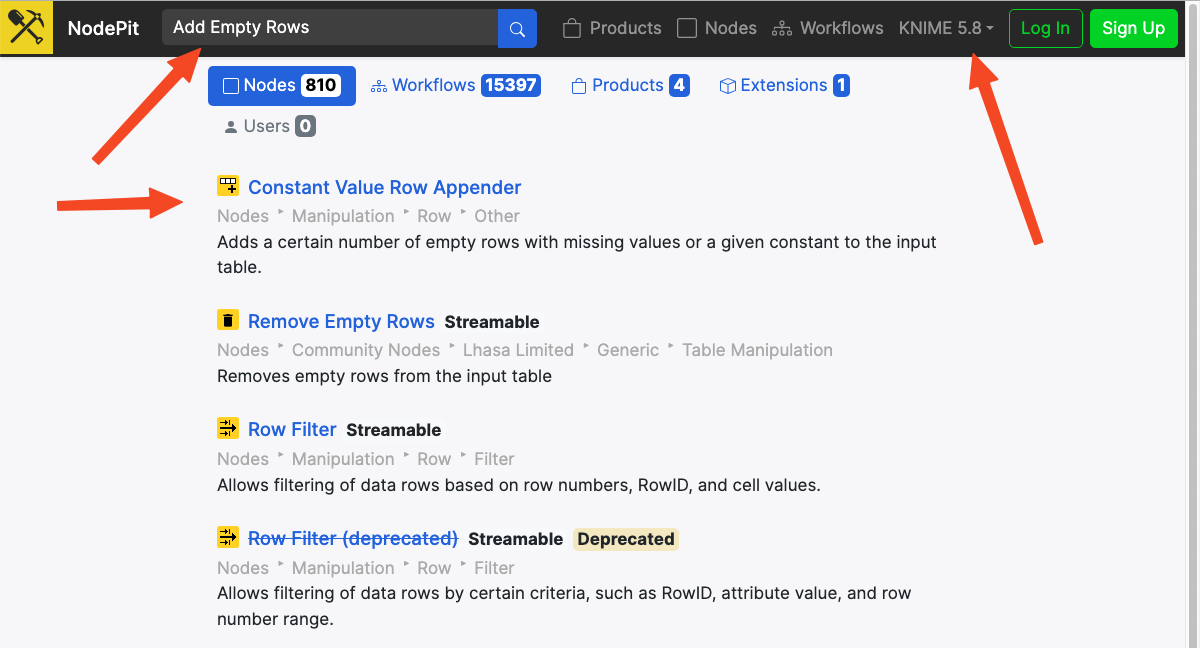 Another interesting point I found is that if I directly search for “Add Empty Rows” in NodePit without specifying a KNIME version, the first result is the renamed version. If I can’t find the node I originally had in mind, this search method might be the fastest way to find a replacement node.
