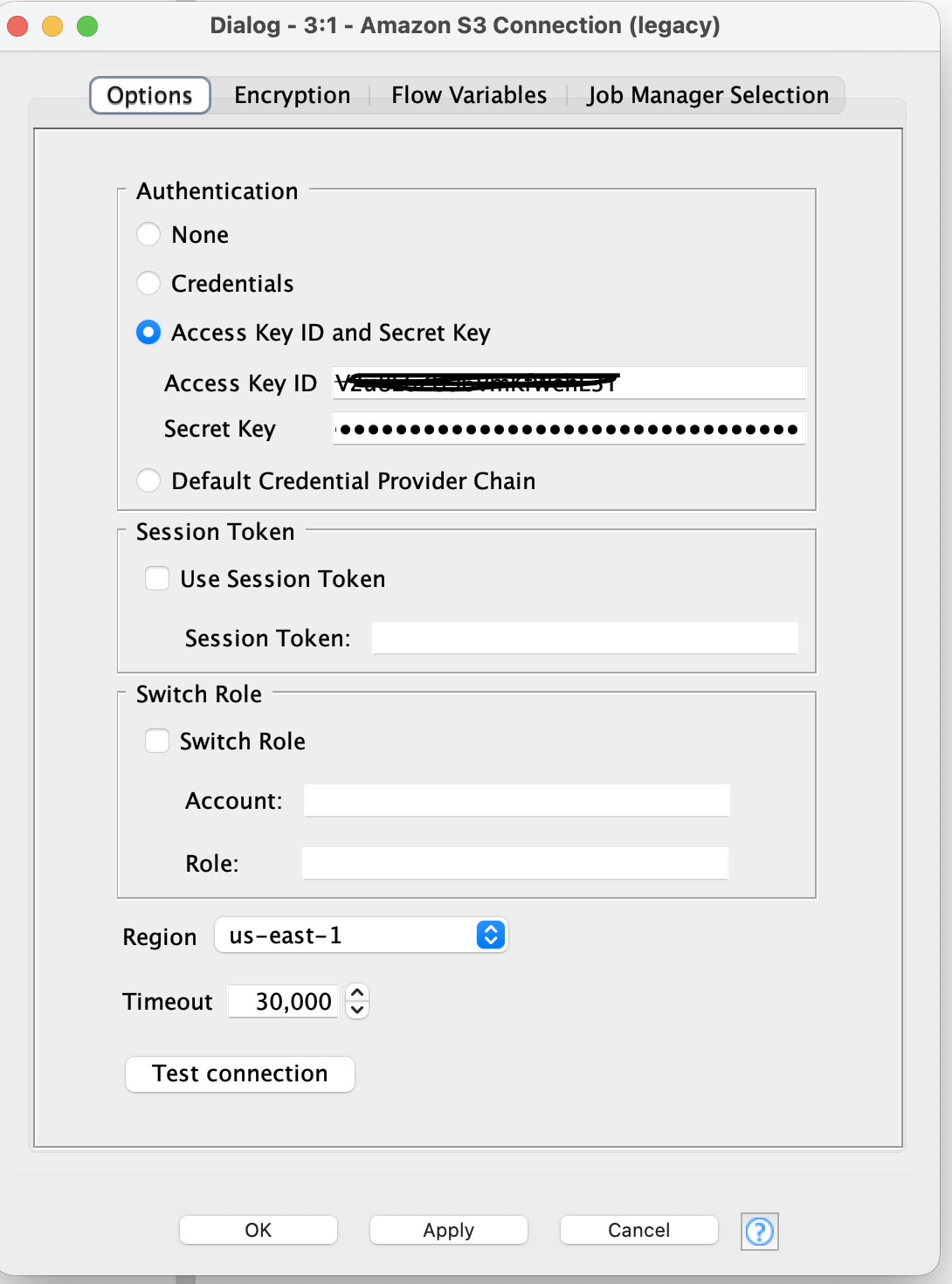 - Ability to configure Access Key, Secret Key, Region, and Custom Endpoint in the connection node (as documented in older KNIME versions).