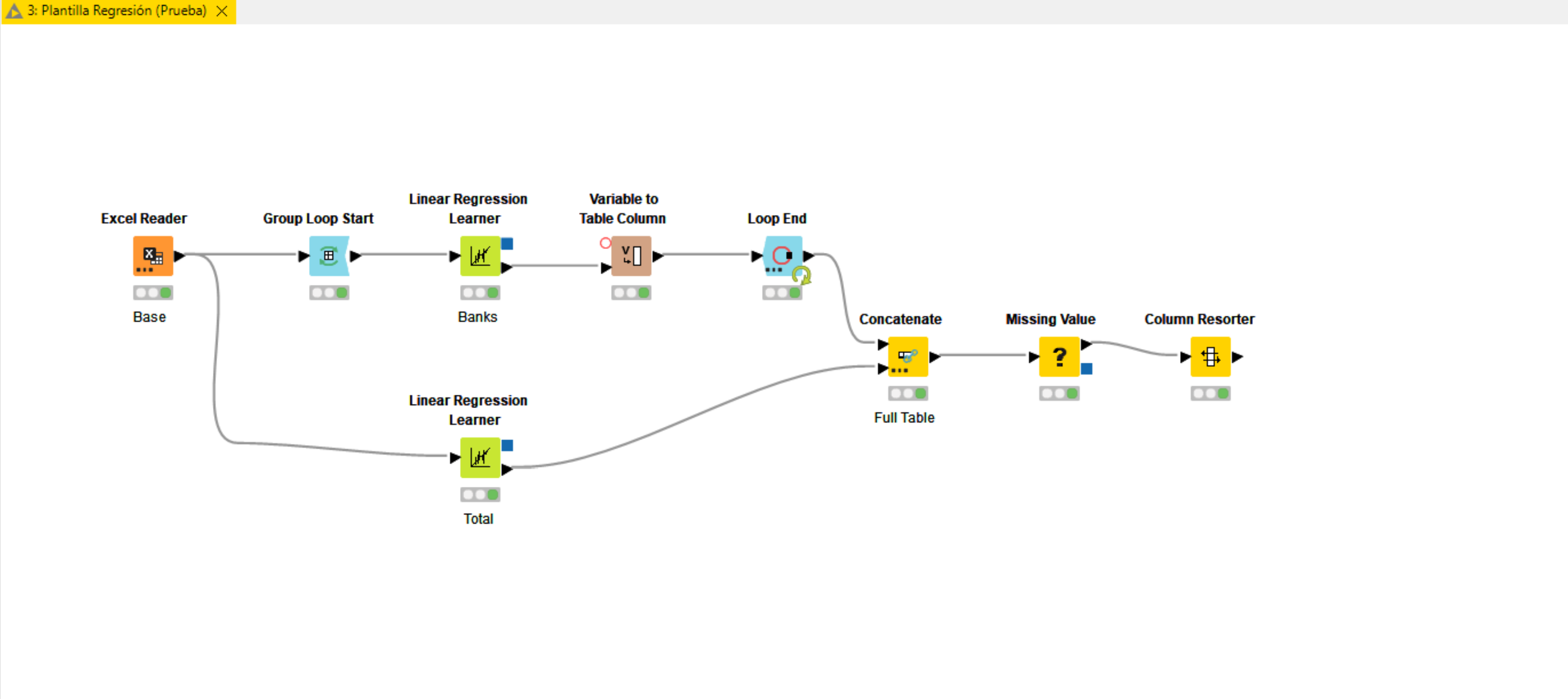 I have made a workflow where I calculate two linear regression models, each with the same dependent and independent (target) variables. In the first, with the help of a “Group Loop Start” I obtain the models of the different categories of a segmentation variable called “Banks” and in the second I obtain the results without segmenting (The regression to total). Finally, I concatenate the results of the two models in a table.