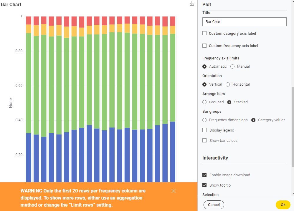WARNING Only the first 20 rows per frequency column are displayed. To show more rows, either use an aggregation method or change the “Limit rows” setting.