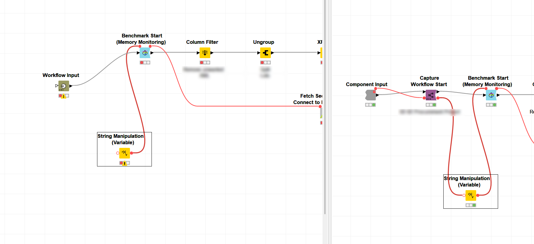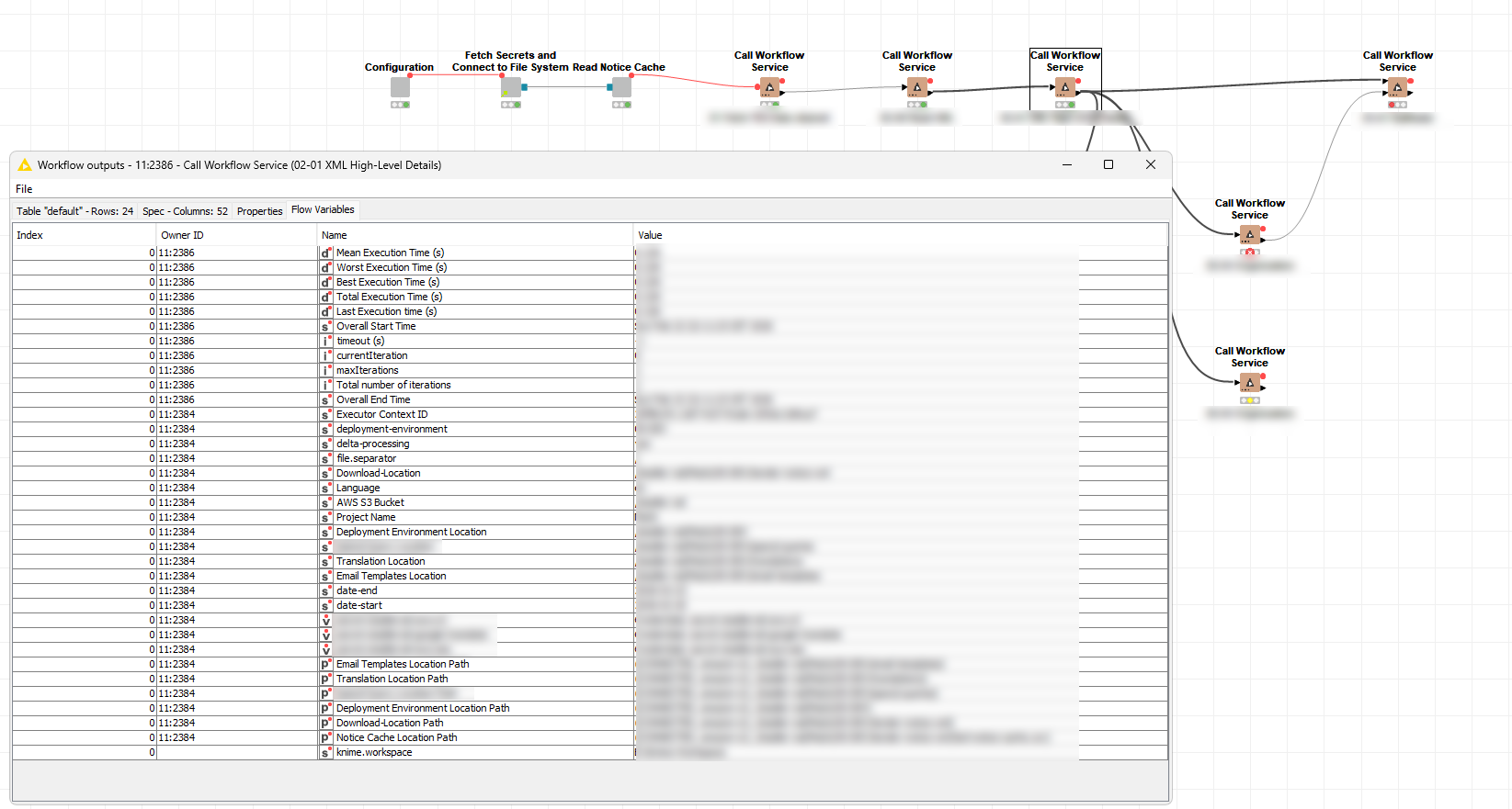 I checked if there is anything in the last working Call Workflow Service node but there is none. No filtering etc. and the variables in question are actually generated in the first three components and used in the three thereafter without any issues.