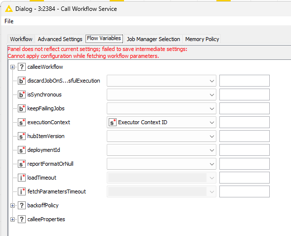 2026-02-22 21:32:15,822 : WARN : main : : WrappedNodeDialog : Call Workflow Service : 5:2384 : failed to apply settings: java.lang.NullPointerException: The parameter workflow-output-2390 does not exist in the properties.