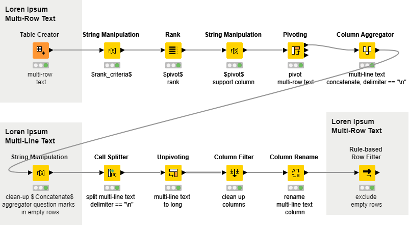 I’ve prepared an upgraded workflow, aiming to achieve text processing to multiline cells within a data frame.