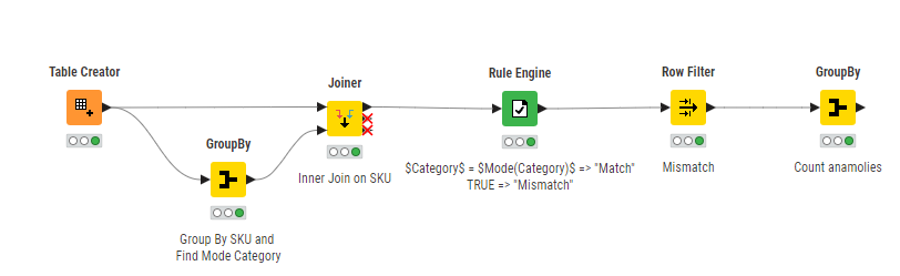 Then add Sorter Node and Sort by Count Column Ascending. That way you get the SKU => Category pairs at the top that have the lowest count and therefore might be candidates for wrong allocation…