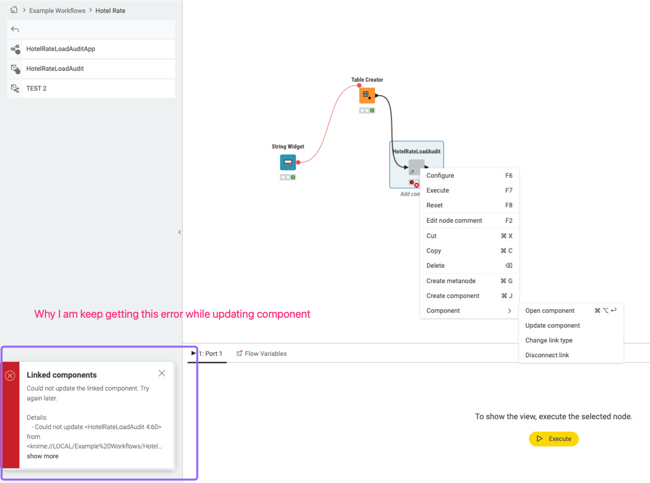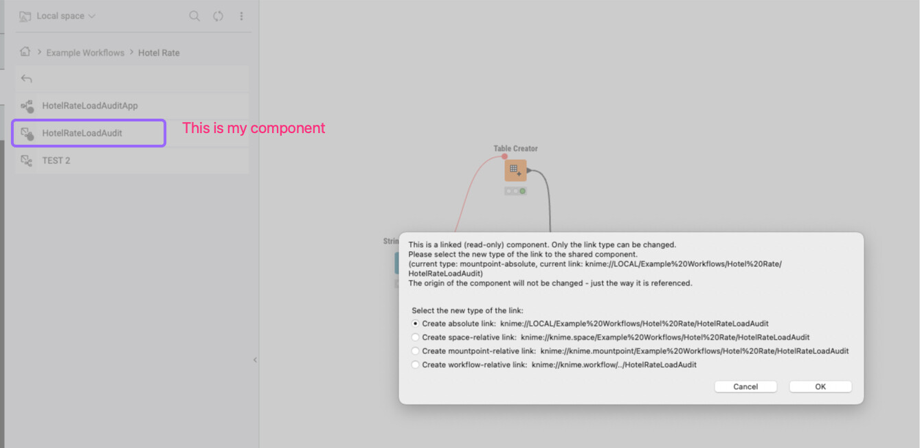 Component is in the same folder as in my main workflow.. I tried both absolute link and workflow-relative link..