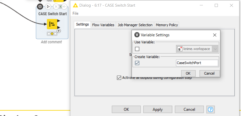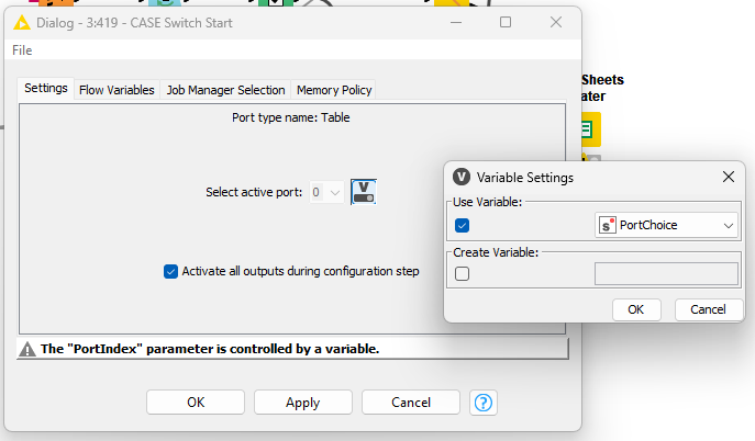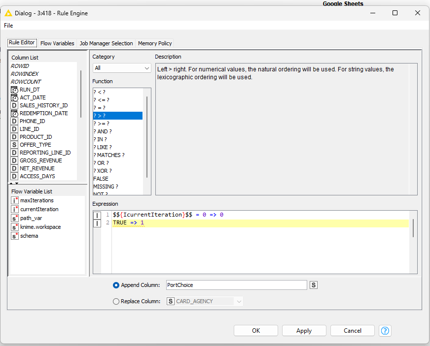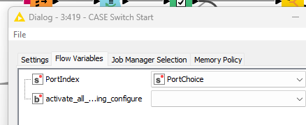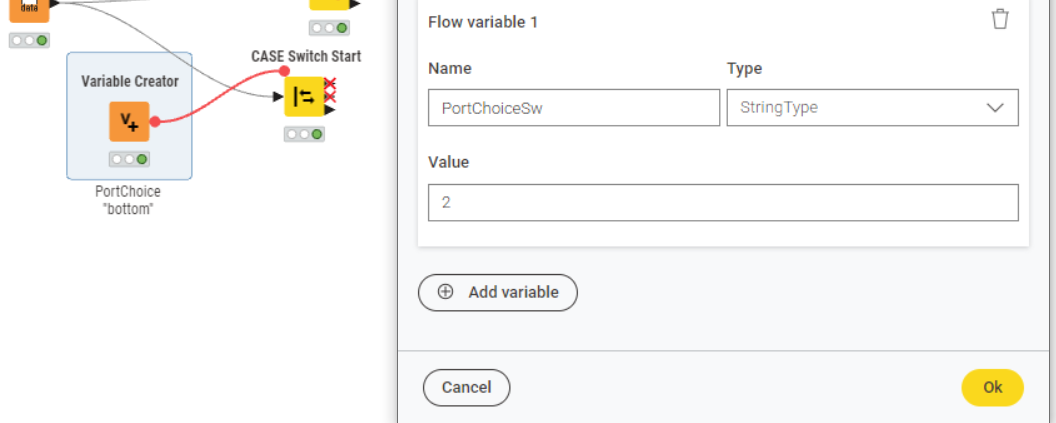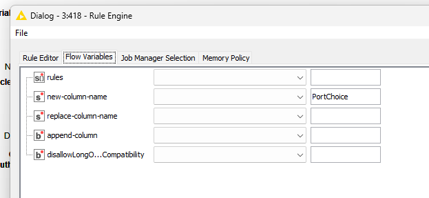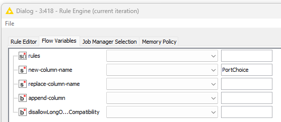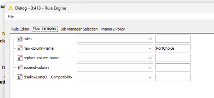 - When you use the text box right next to a flow variable setting in a flow variable tab, in your case you are using the setting to set the name of the new column to be created in your rule engine, you expose the value of that setting, in your case the name of the column that you add (PortChoice) via a flow variable => You create a Flow Variable “PortChoice” and its value is “PortChoice” (not top or bottom)