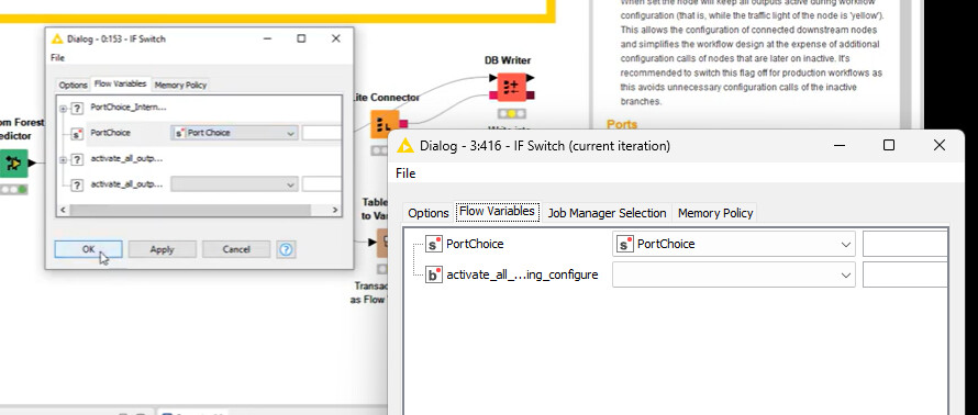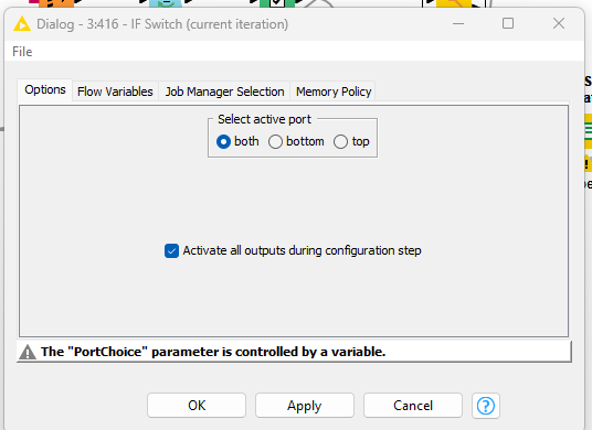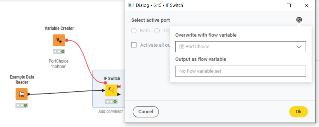 To make sure it’s passed downstream as a flow variable I’m connecting the output flow variable to the flow variable input of the IF SWITCH.