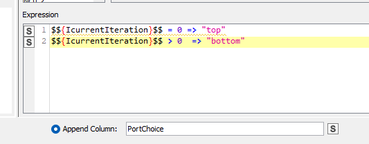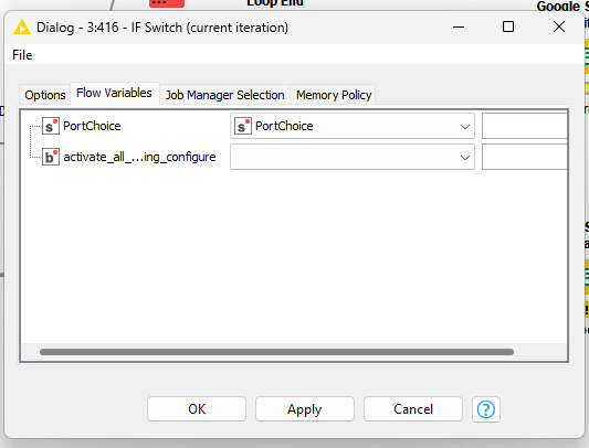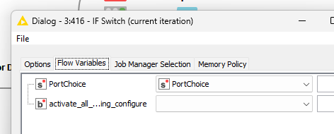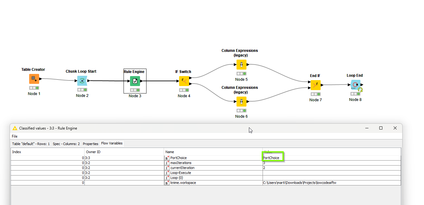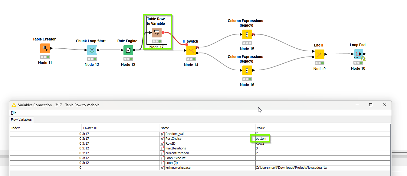 - My Approach exposes the value of the first row in the column PortChoice via flow variable => Flow Variable “PortChoice” with value top or bottom (depending on the iteration)
