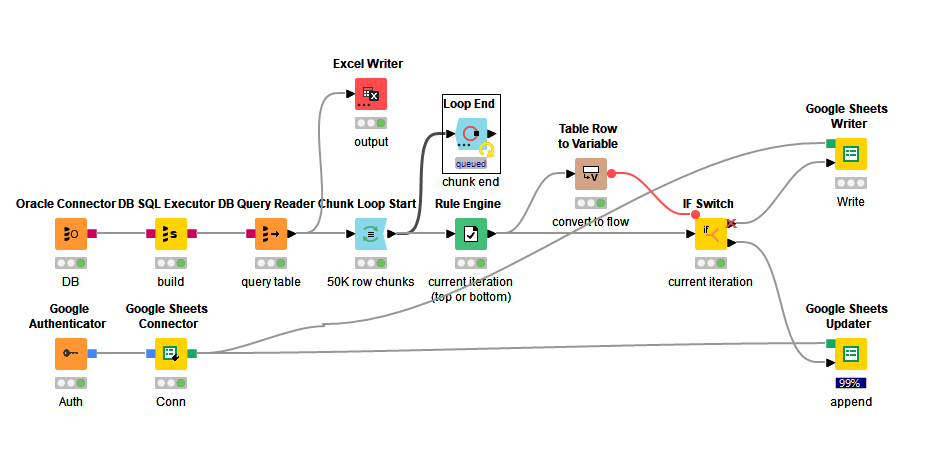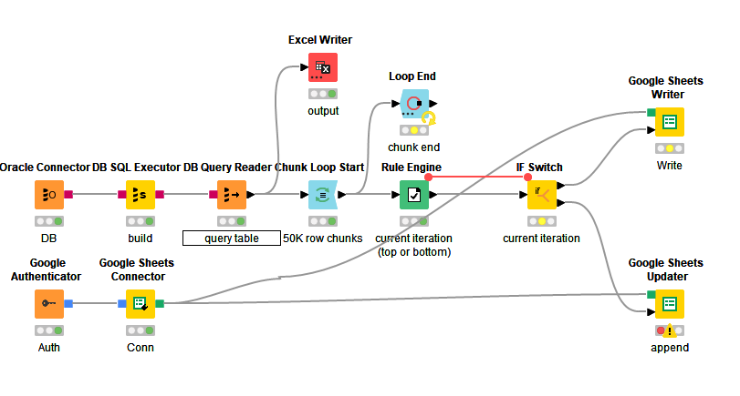 Google Sheets has a payload limit.  You can’t even import a file that has more rows than the API will allow.  So with Knime you have to create a chunk loop and incrementally update Sheets.  The Google Sheet Writer doesn’t append and it can’t load more records than the API will allow, so the logic I’m testing is to create the sheet with the initial payload and then when the chunk loop reaches the second iteration it switches to the Google Sheets Updater which continues to append subsequent records.