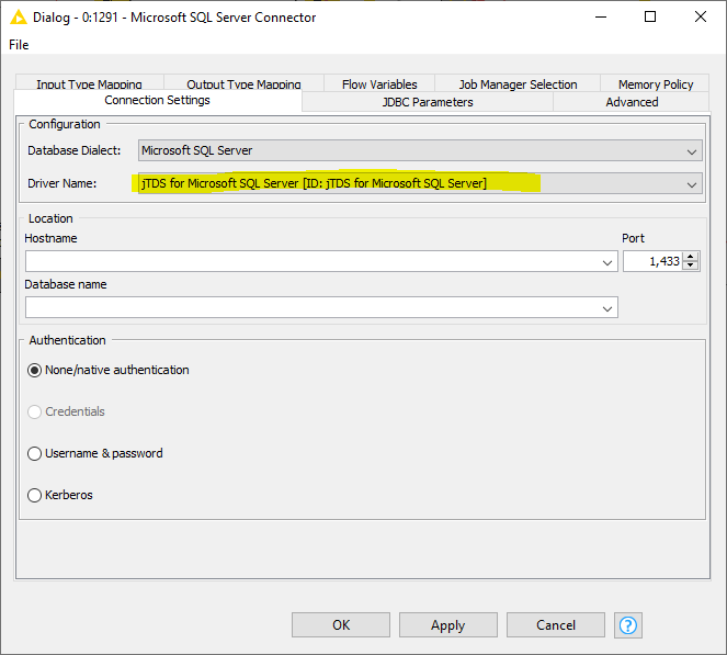 You could also try to use the jTDS driver that is included in the KNIME Analytics Platform installation. To use it open the node dialog of the Microsoft SQL Server Connector node and select the jDTS for Microsoft SQL Server driver as shown below: