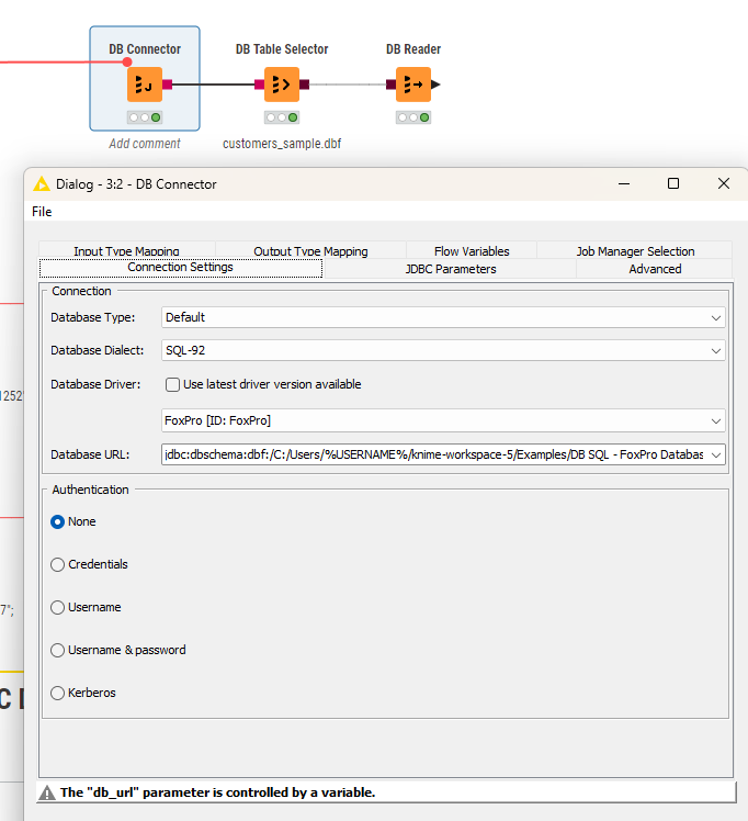 Then you configure the DB Connector node with a custom string pointing to the location of your DBF files (the folder not the individual file although that might also work):