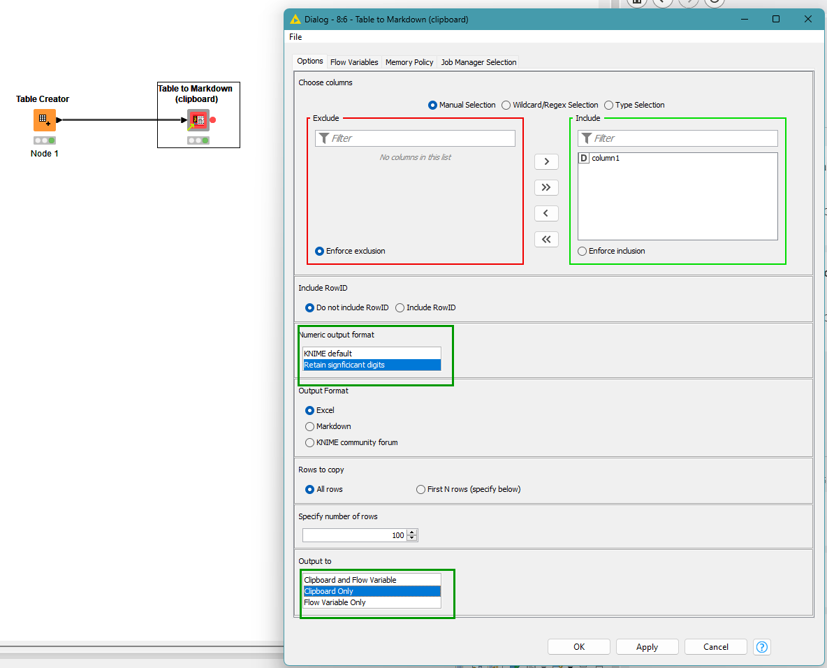I have a component on the community hub Table to Markdown (clipboard) that may be able to assist with copying to clipboard. Attach it to the output of the node in question and specify the columns to copy and it will copy them to clipboard. I’ve just updated the component to give the option of attempting to copy significant digits, rather than KNIME default. When the node executes, it copies to data to clipboard for you, so you don’t have to do it manually.
