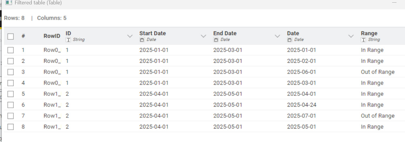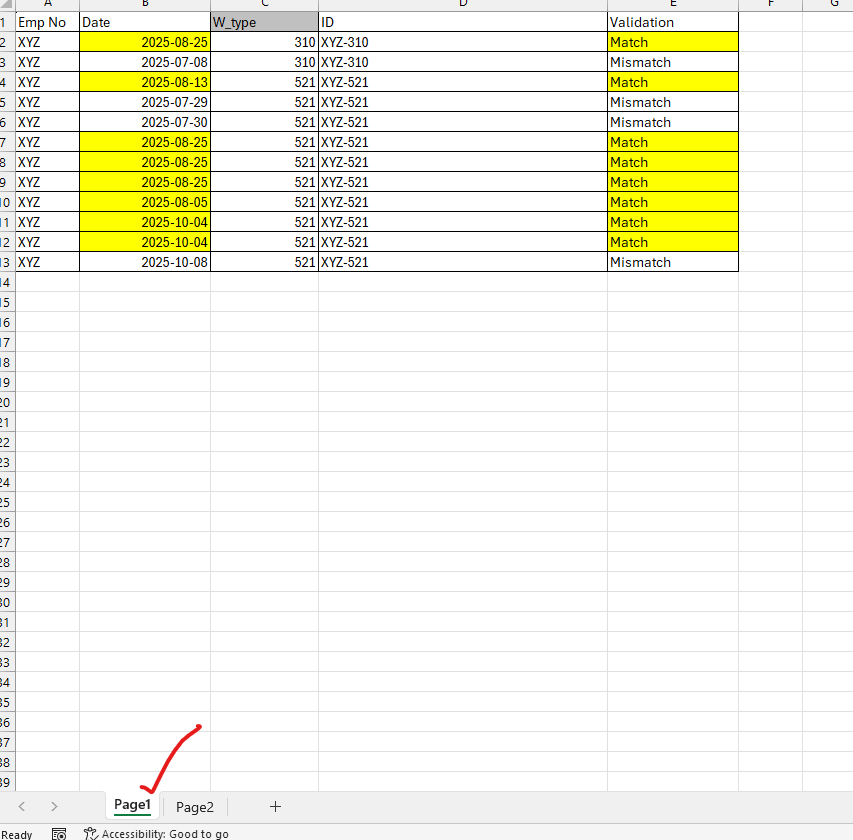 Then check and loop Page1 as similar like below , match ID first then check if the Dates on Date column is between the Dates range of page 2 Start and End dates (Date column dates >= Start date of page and <= to End date of Page2 date) . The give result match for dates matching rows else mismatch as similar as below, i have thousands of rows similar pattern.