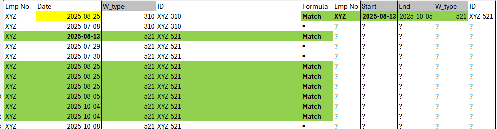 Basically it is an absence report, we need to check first unique ids of page 1 is matching with page 2 unique ids , and then check date column of page one is >= Start date <= end date of matching unique ids in page 2 , then i should get result as match in page 1 for all Matching row else mismatch. As I said challenge is empty rows comparing after joining two files. Due to one unique row items for each unique ids