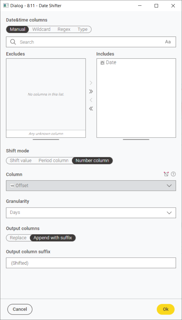 With “add_date_duration($[“Date”], parse_date_duration(“P-1D”))” it’s possible to substract a day from you date column.