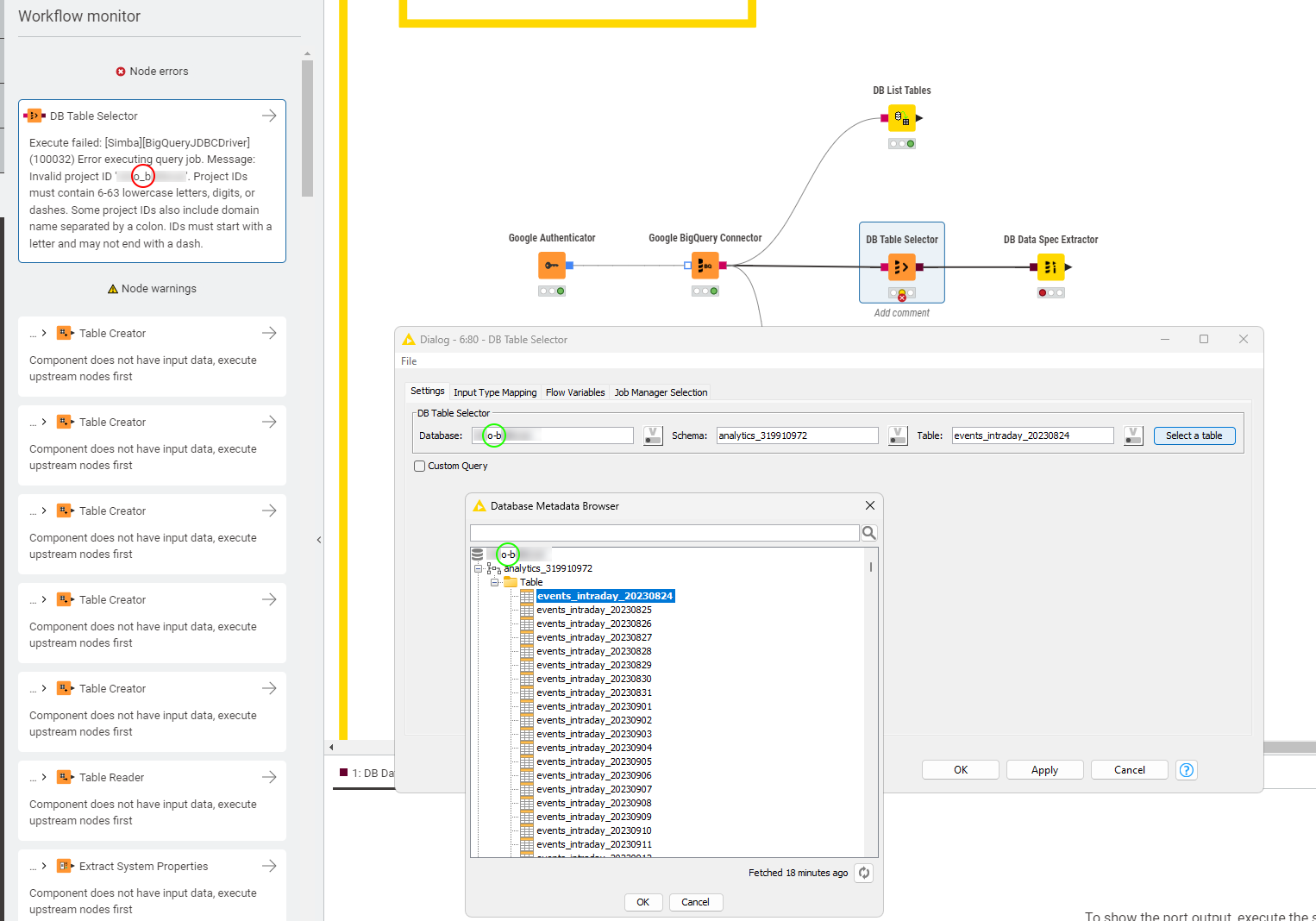 it appears the DB Table Selector is applying some sanitization causing the Project ID to become invalid. Using the select a table option and all prev. nodes worked perfectly fine.