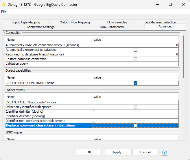 this option is enabled by default if you select Google BigQuery as database dialect e.g. in the DB Connector or in the Google BigQuery Connector node.