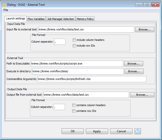 I see. I suggest you use relative paths in these cases. Create data folder within your workflow folder and there create text.csv file. Relative path to the file is then knime://knime.workflow/data/text.csv. This way transferring your workflow to Server or sending it to colleague doesn’t affect execution. Also you can create script folder in the same place and access Refresh.vbs and cscript.exe with relative paths. If the exe is too big and you will use it in multiple workflows having it with every workflow doesn’t make sense so find an adequate place on your KNIME Server and point your External Tool node to it.