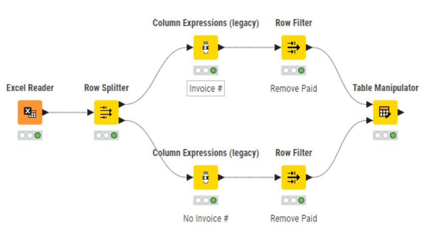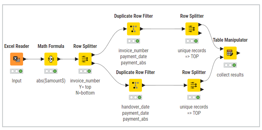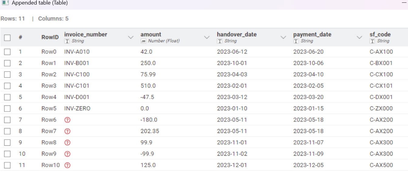 I built a workflow to process a payments report and ran into the following situation. I have the columns: invoice number, amount collected, invoice handover date, invoice payment date, and invoice code.