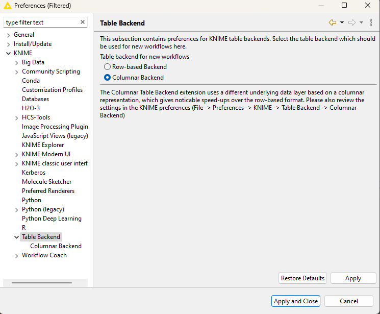 KNIME itself also allows for the use of columnar storage in the background. You can try and see if this makes any difference.