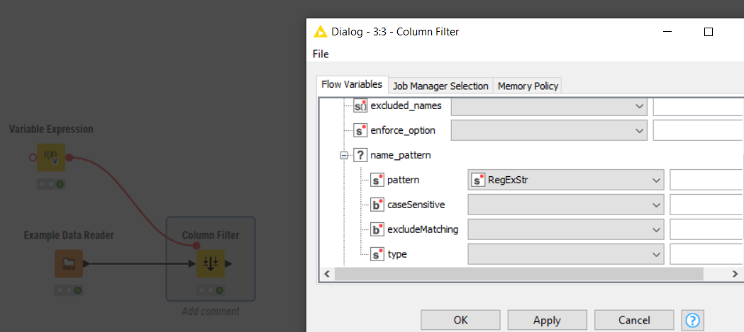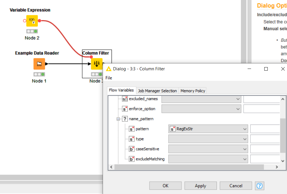 The Column Filter node does not support dynamic regexes passed via flow variables. I build this piece of workflow to select dinamically group of column to display in a table view (I have to much column!!) but it isn’t work. The same Regex passed via flow variable work regularly if written “manually” in the node. Below you’ll find the piece of workflow.