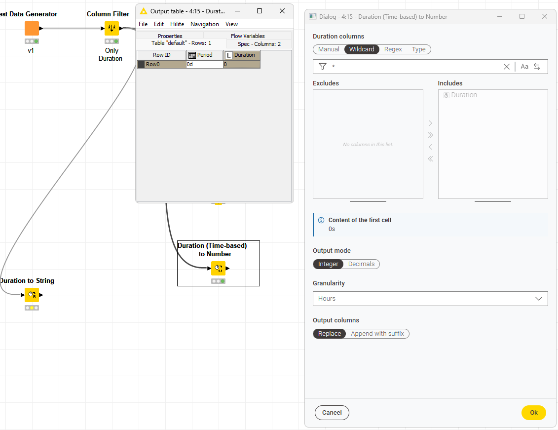 The Duration (Time-based) to Number node only covnerts to long type despite Integer being set as output mode, which is difficult to work with too.