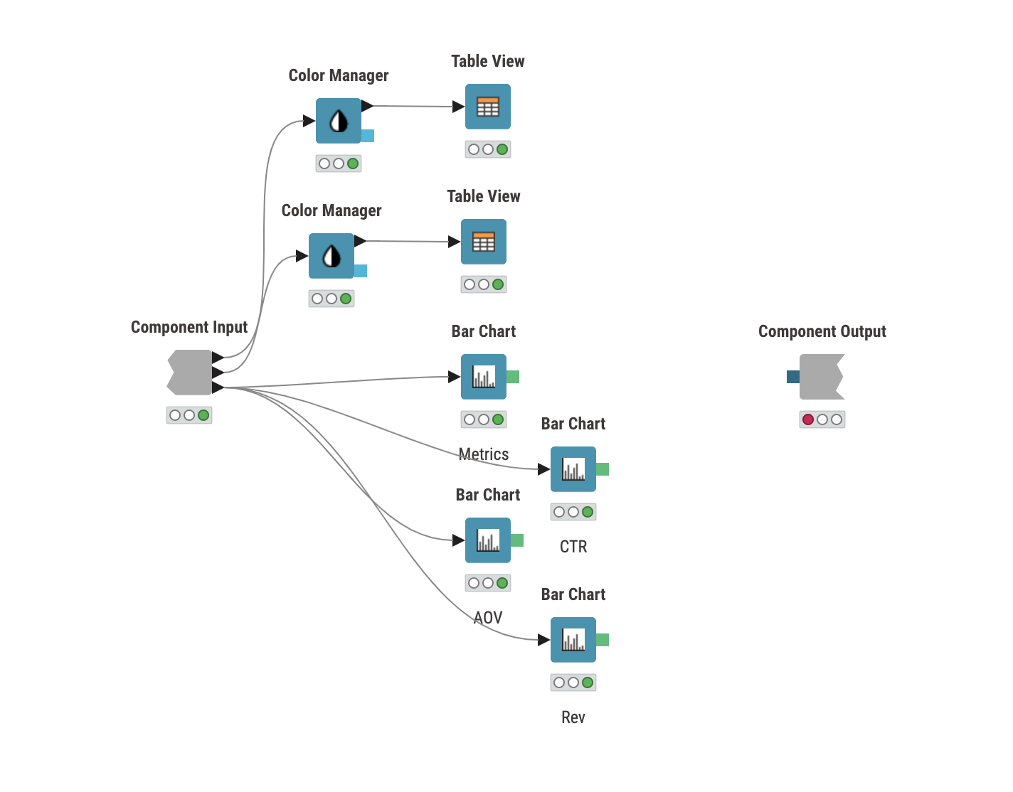 First you need to enable report in the component layout editor. Go inside the component and on top you find the button to open the layout editor where you can find the “Enable reporting” option at the bottom. After enabling the component report, the corresponding report input/output ports will be added to the component. You have to connect the Report Template Creator node to the input port and then connect the report output port to the Report PDF Writer. After generating the report PDF, you can send it as an attachment using the Send Email node.