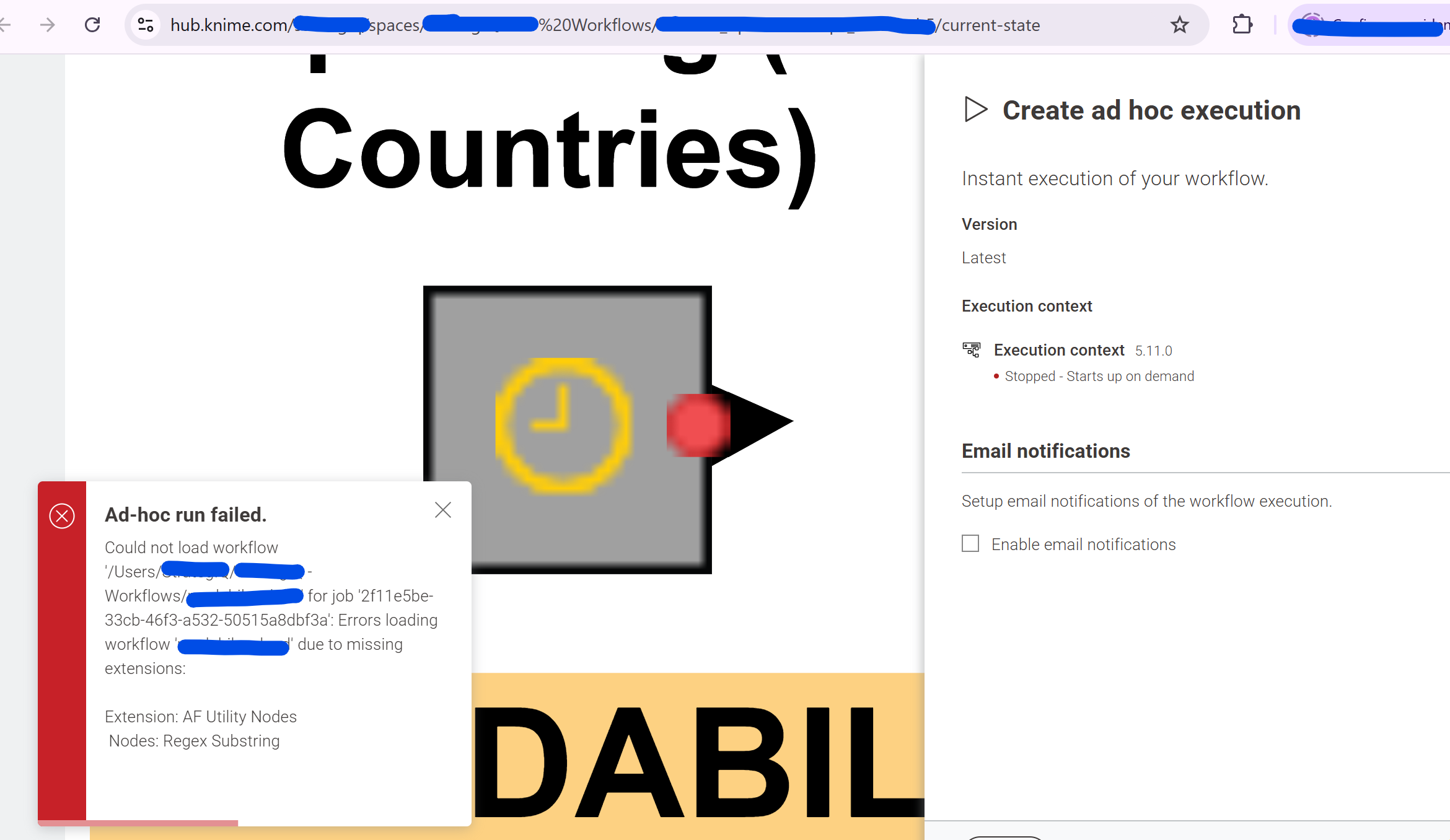 Could not load workflow 'workflow_name’ for job ‘677839a5-f8cc-42f7-9a15-3015ba1a5679’: Errors loading workflow 'workflow_name ’ due to missing extensions: Extension: AF Utility Nodes Nodes: Regex Substring