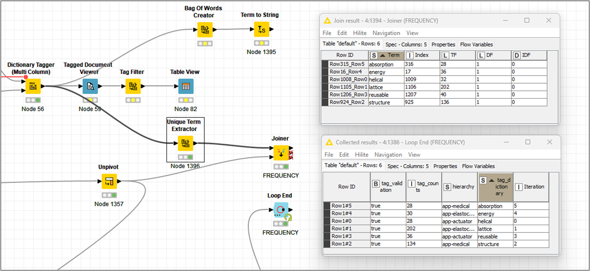 I’ve tested to count tagging from two approaches, getting back slight differences in the results. The source text is a complex pdf document. Then for simplicity, I would rely on ‘Unique Term Extractor’ node.