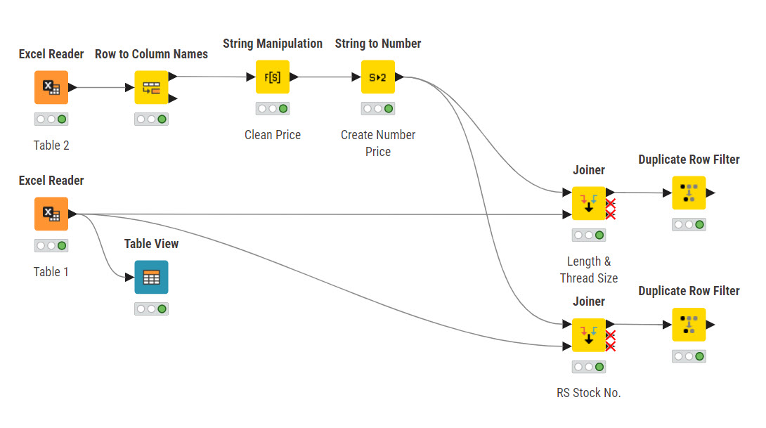 I have two Excel lists with data records. One list contains approximately 6,000 data records and the other 50 data records. These data records are items or screws. For few items in the 6,000-record list, there are four similar items in the 50-record list. Properties such as description, price, item number, etc. are of course different, but they are the same item. How can i use KNIME to find the other four similar items in the 50-record list based on a description?