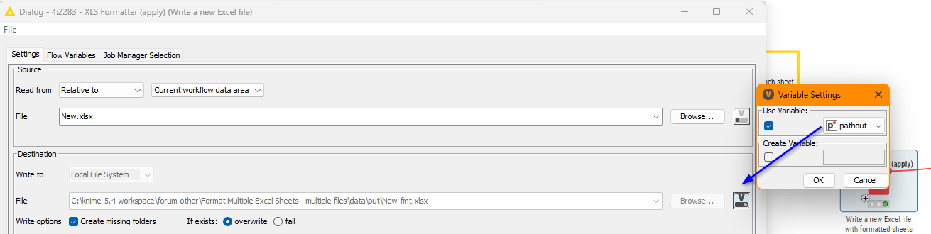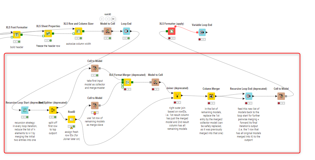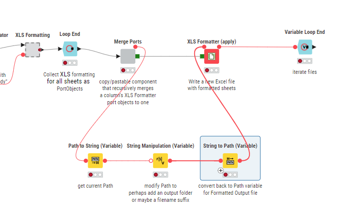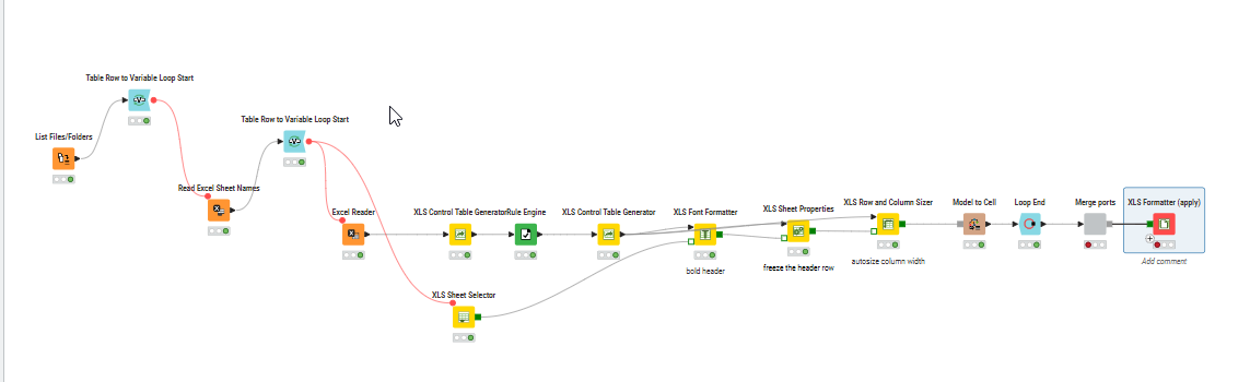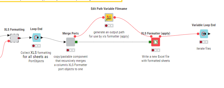 I say almost because when I looked at that, I could see there was one very important missing ingredient: there was nothing that defined the changing output file in the XLS Formatter(apply) node. So it would be repeatedly writing to the same output file, regardless of the input file.