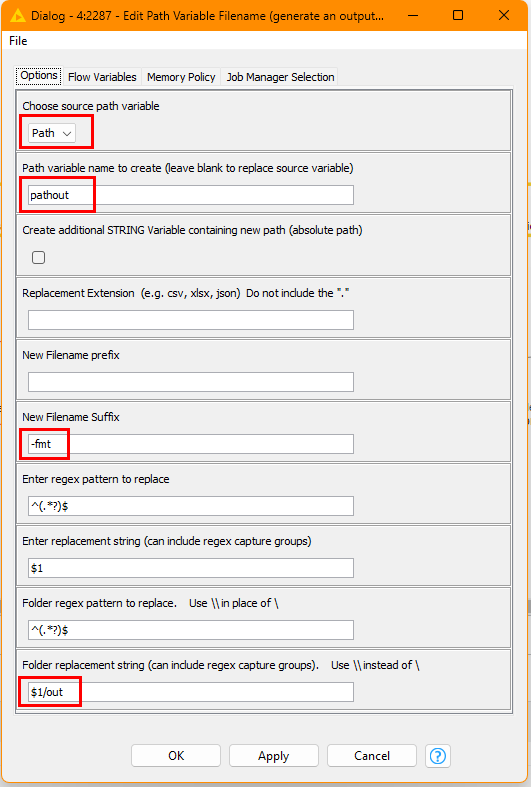 In the above configuration, the value in the existing path variable named Path is used to create a new path variable called “pathout”. The current path will be adjusted so that the filename is given an additional suffix of “-fmt” (my abbreviation for formatted) and the output folder will be based on the current input folder, but with the addition of the subfolder “/out”