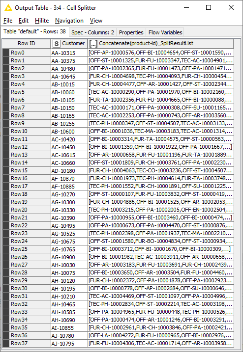 Using the Group By node, the table is in a format where one Customer entry with numerous products, essesntially a list of transactions made by every unique customer.