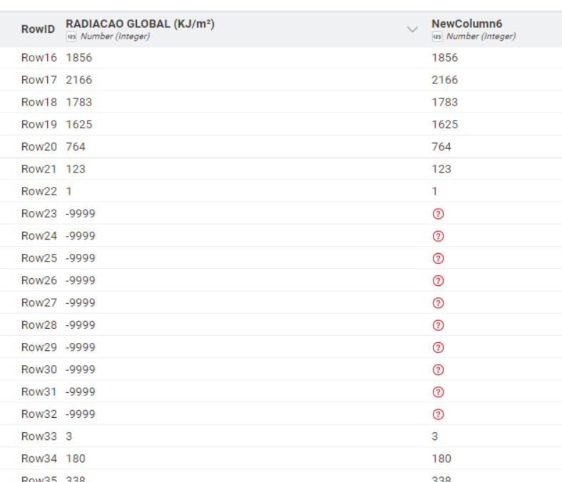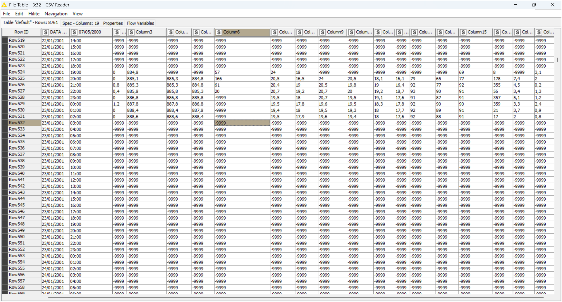 After reading the data with the CSV Reader, the -9999 values are still present.
