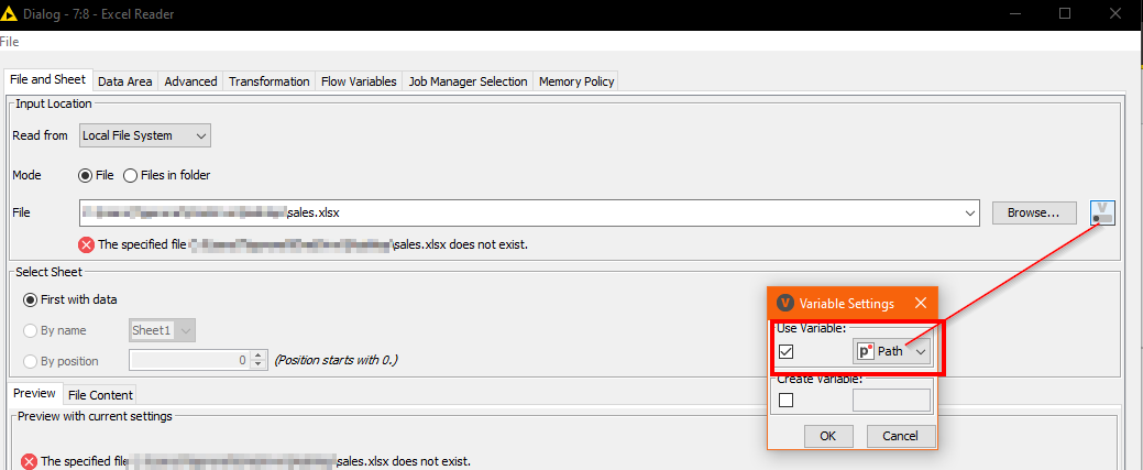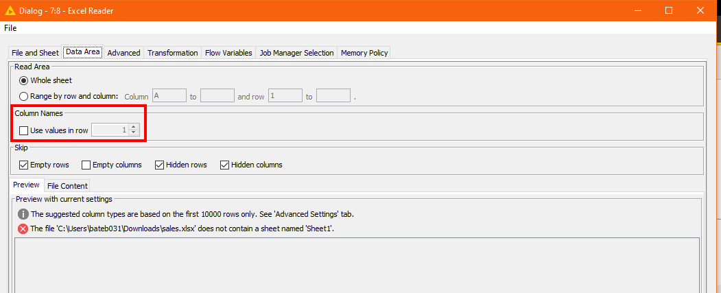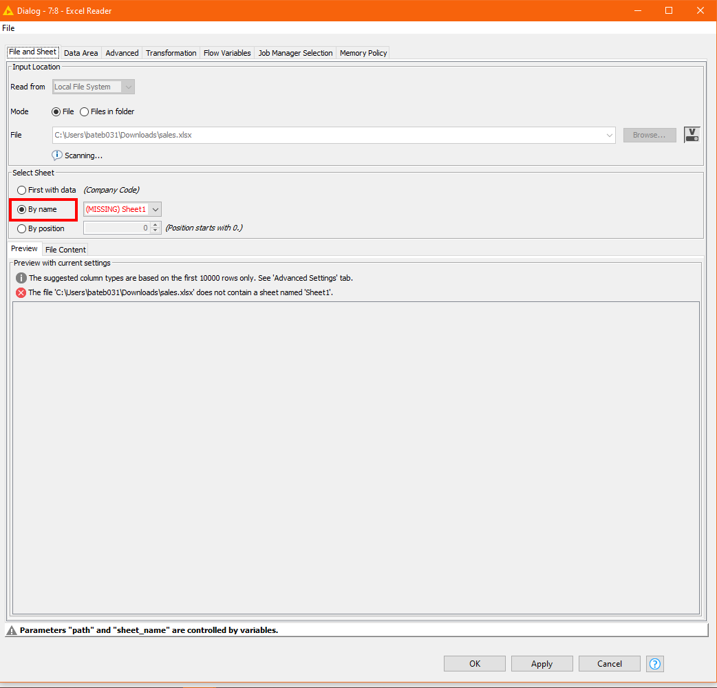 Secondly, your config is still set to Select Sheet based on “First with data” rather than “By Name”. You have to change this as mentioned earlier, either by setting it manually in the Excel Reader node, or by using a flow variable as described in the link I posted before.