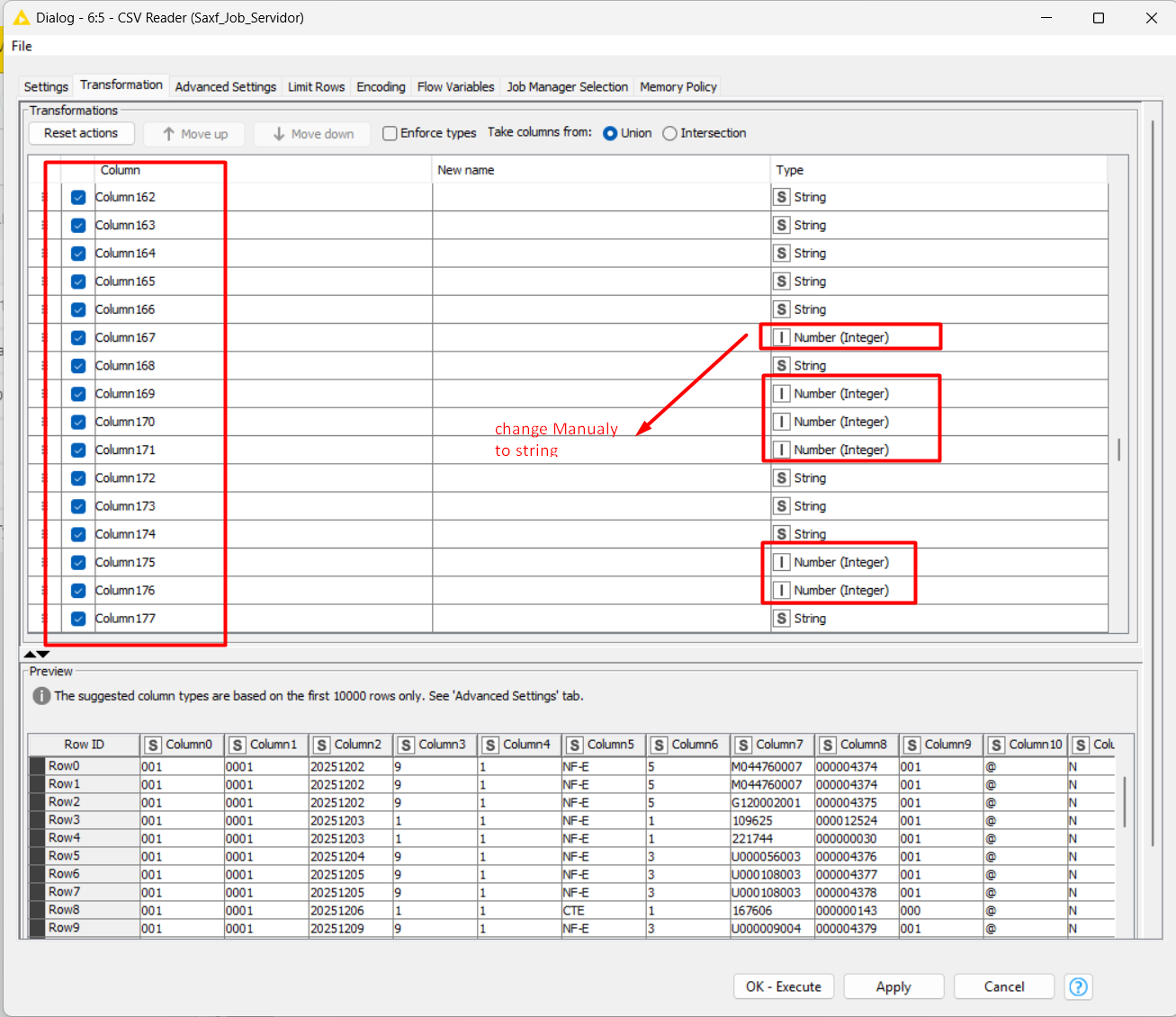 All files share the same structure. The problem is that in the CSV Reader, I have to manually change every single column to ‘String’. Even after doing that, if I reopen the node, it might re-interpret them as integers, forcing me to do it all over again.