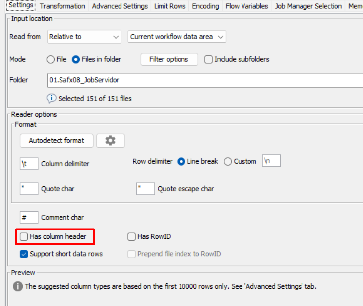 A key point: my CSV files do not have headers, so I already have the ‘Has Column Header’ option unchecked.
