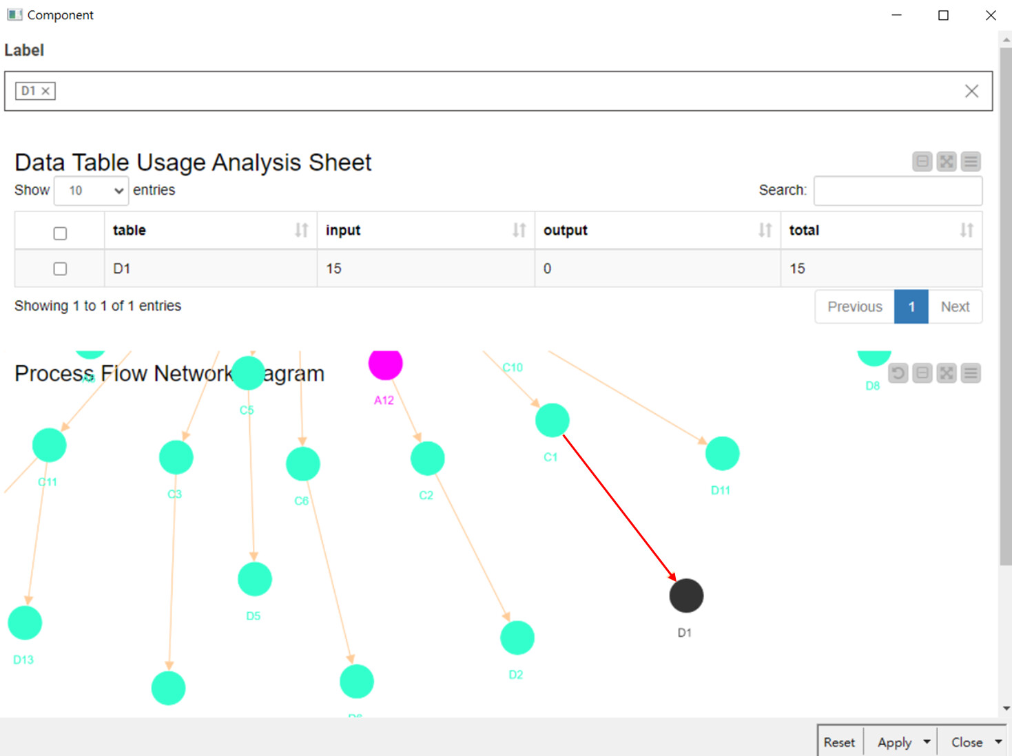 For example, if I select D1, I would like the corresponding node in the network graph to be displayed in black, while its connected edges should be shown in red with a width of 3.