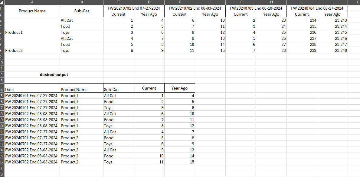I’ve been struggling with this problem with no solution in sight. I’m trying to move the column names as rows under a new column ‘Date’ and use ‘current’ and ‘year ago’ as my new columns. I tried using both unpivot and transpose with no luck. attached is a screenshot of my current table along with the desired table.