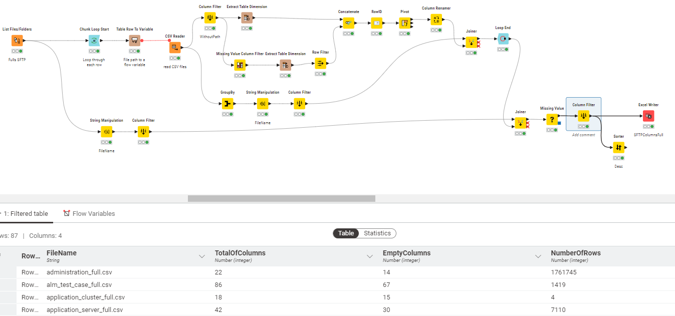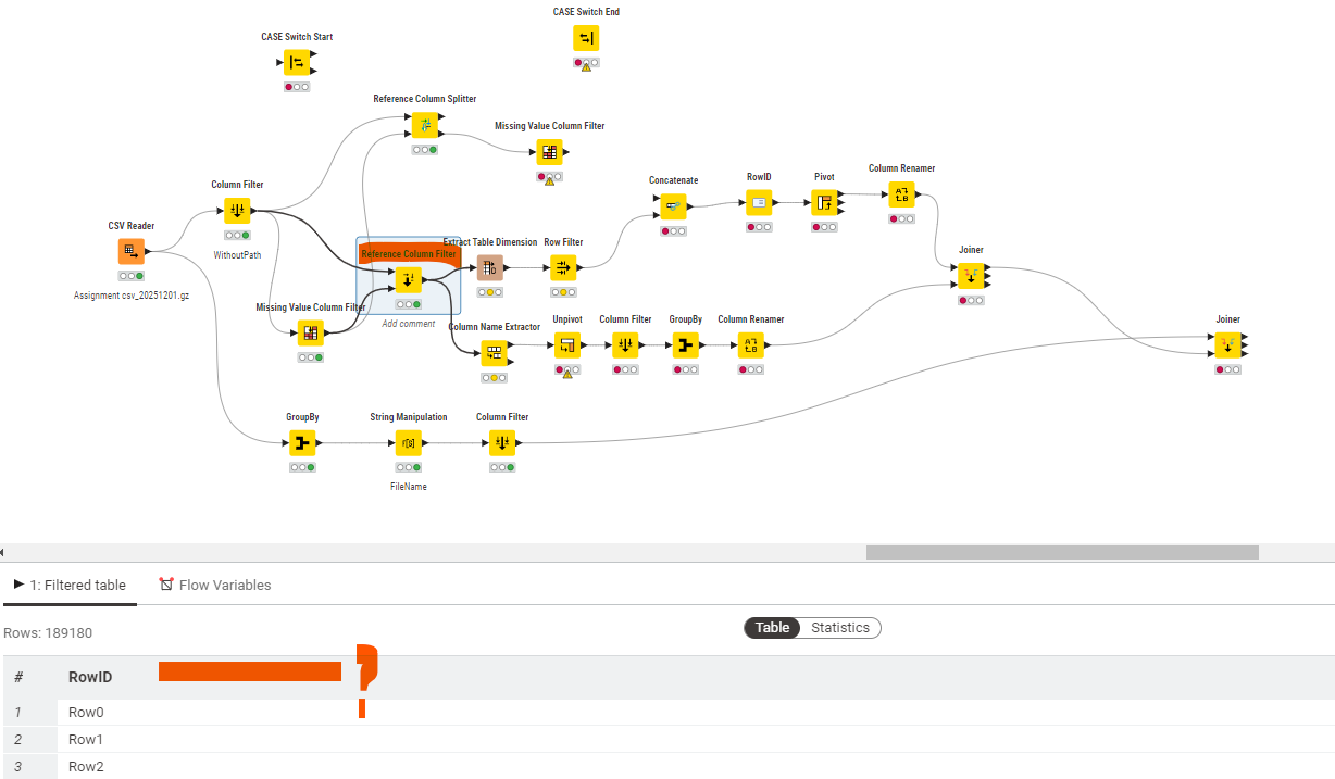 but the problem I am having is that the “logic” of my workflow only works with files that have empty columns, if there is a file which has got all columns populated, then it does not work because the first “join” operation was bringing the empty column names via INNER join ON RowId. I am finding difficult implementing a “Case Switch Start” and “Case Switch End” nodes to overcome this situation, this is where I am stuck:
