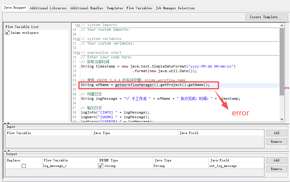 However, in KNIME 5.x these methods do not seem to be exposed to Java Snippet anymore, resulting in: