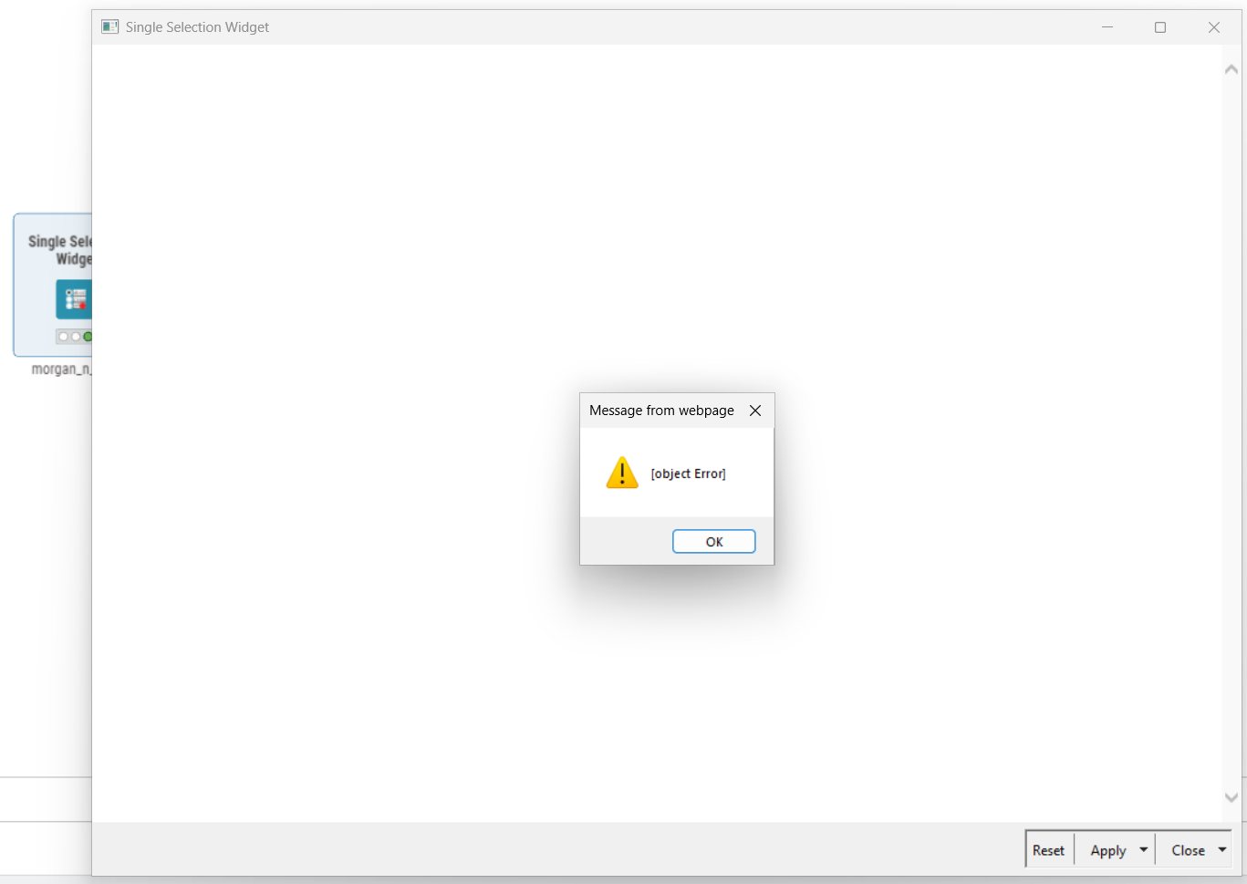 A completely fair point. However, this is happening both in the workflow I have built and also if I open a new workflow, place a single selection widget and try to open the view. I’ve tried without adding any configuration to the widget and after adding simple options - I get the same error every time.