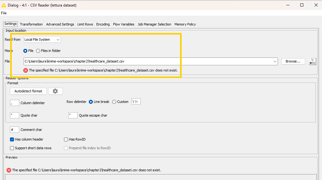 Thanks for sharing the workflow. Right now the CSV is being read from your local file system, so others can’t execute the workflow as-is. Please attach the dataset with the workflow (put the file inside the workflow’s data folder and re-export the workflow), and switch the reader to use a Relative to path (Relative to → Current workflow data area). Docs: KNIME File Handling Guide