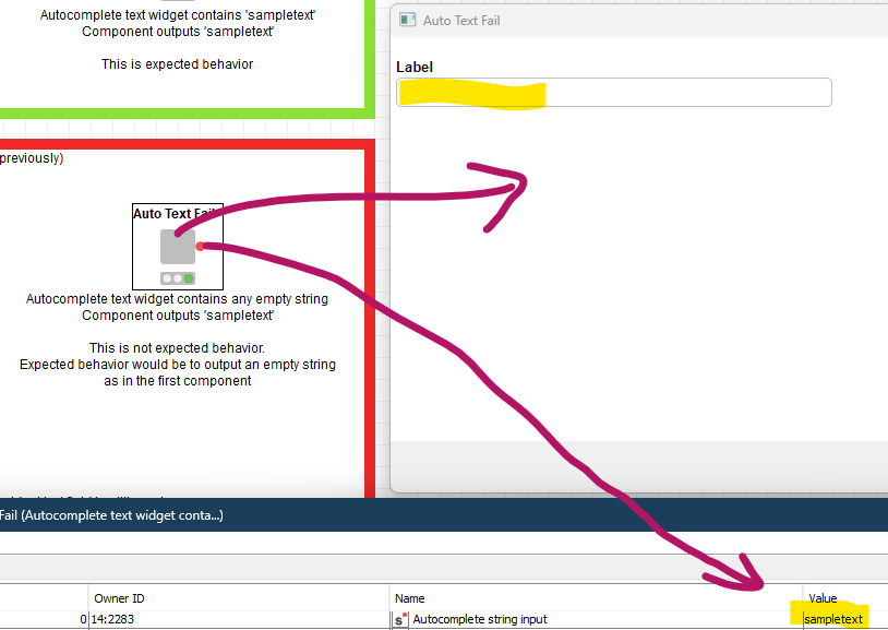 If I enter ‘sampletext’ into the Autocomplete text widget, and hit my refresh button, it updates the flow variable output for that widget.