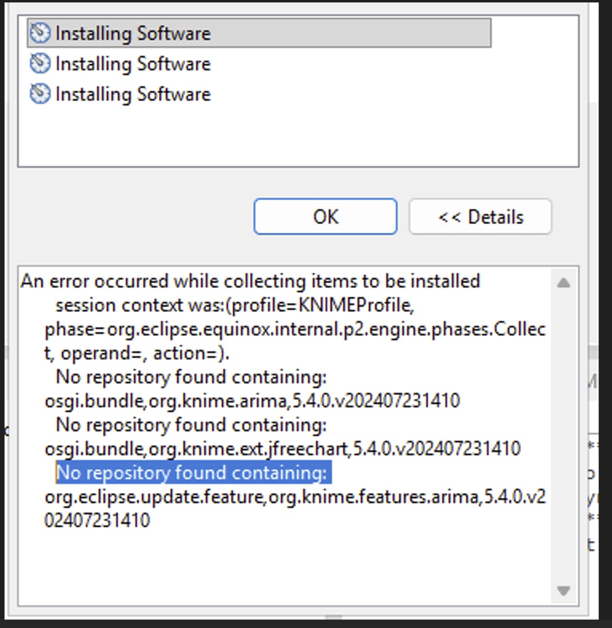 We are having an odd problem with extensions. We were using a web interface to handle the extracted zip files with the extensions but with the version we were getting errors about “no repository found containing: xxxxxx. We switched to the actual archives as zip files on the windows share. Now some users can install the extensions where they could not install before. Other users still get the same error on every extension. We know they can navigate to the share and read the folders. The entire extension list populates in KNIME. When they select an extension the install process starts. and resolves the name, version and id. When the click the finish to get it to install they get an error like below, but different module names depending on the extension.