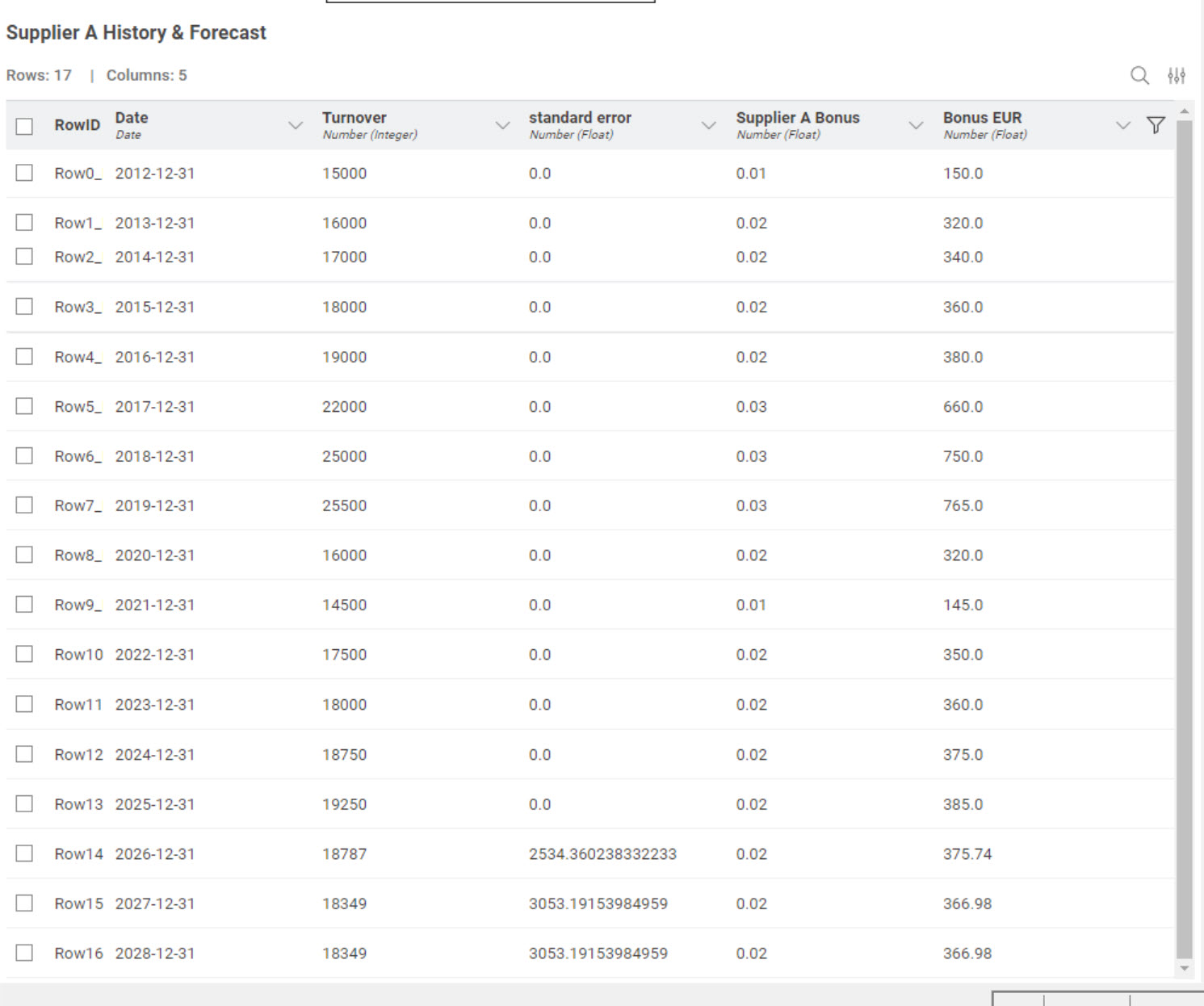 I have turnover data from various suppliers for the last 13 years (on years base), including possible bonus agreements. I would like to build a workflow that processes this data and provides me with future sales predictions for the next 2-3 years and, if possible, the corresponding bonus values.