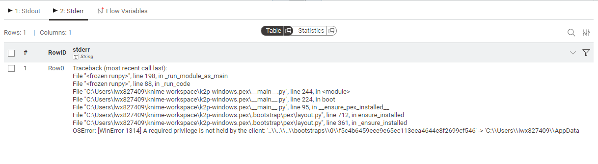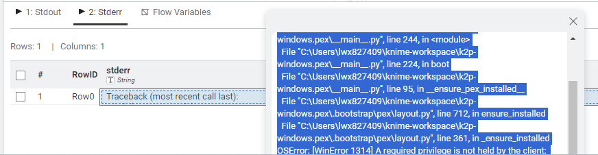 Traceback (most recent call last): File “”, line 198, in _run_module_as_main File “”, line 88, in _run_code File “C:\Users\lwx827409\knime-workspace\k2p-windows.pex\_main_.py”, line 244, in File “C:\Users\lwx827409\knime-workspace\k2p-windows.pex\_main_.py”, line 224, in boot File “C:\Users\lwx827409\knime-workspace\k2p-windows.pex\_main_.py”, line 95, in _ensure_pex_installed_ File “C:\Users\lwx827409\knime-workspace\k2p-windows.pex\.bootstrap\pex\layout.py”, line 712, in ensure_installed File “C:\Users\lwx827409\knime-workspace\k2p-windows.pex\.bootstrap\pex\layout.py”, line 361, in _ensure_installed OSError: [WinError 1314] A required privilege is not held by the client: ‘..\\..\\..\\bootstraps\\0\\f5c4b6459eee9e65ec113eea4644e8f2699cf546’ → ‘C:\\Users\\lwx827409\\AppData\\Local\\pex\\Cache\\unzipped_pexes\\3\\86965d676572479dae0c3e9dcd04b0e07c623600.lck.work\\.bootstrap’