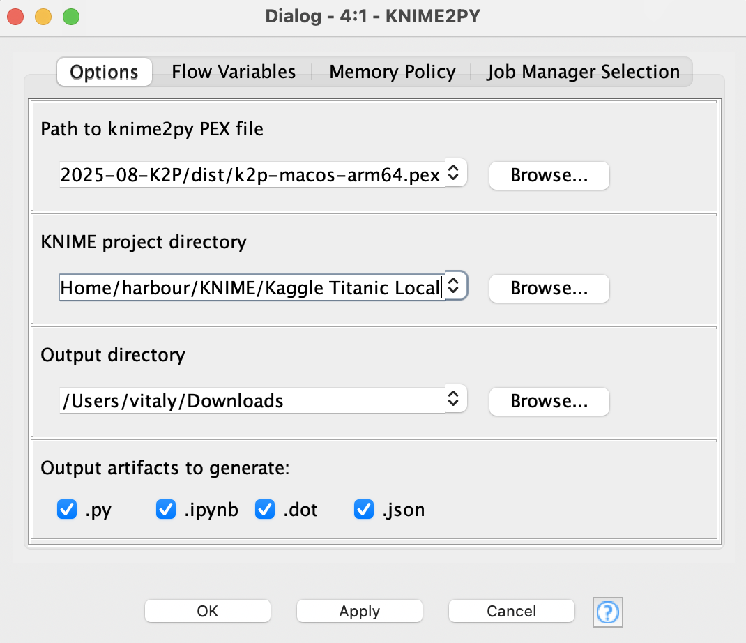 distribution for your OS from the Releases page ( Releases · vitaly-chibrikov/knime2py · GitHub ) and set this path. -