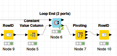 The second input/output port of the Loop End corresponds to a Column Append, if it is used in this way. The Pivoting node should be provided with a column containing the future column header and a column with the future row id.